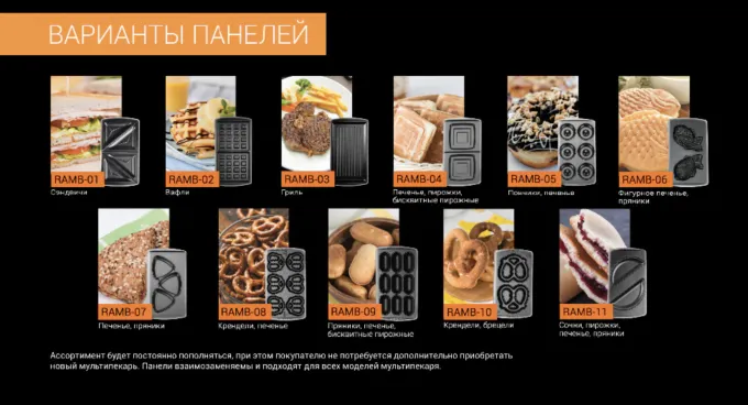 В чем основная киллер-фича этого устройства? В сменных антипригарных панелях. В базовом наборе их идет три: гриль, для вафель и для крендельков. Этого вполне хватит на первое время, но если вы по-настоящему оцените прибор, то сможете докупить панели для омлета, печенья, пончиков, сэндвичей и даже легендарных орешков с вареной сгущенкой. Все возможные варианты можете посмотреть ниже.