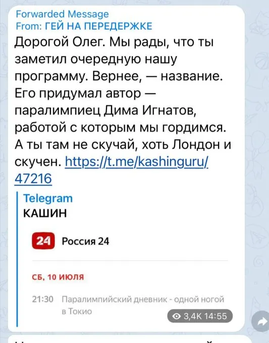 Несмотря на то, что передача начала выходить 18 июня, внимание на креатив RT обратили только сегодня. В частности, скриншот с телепрограммой, в которой указано время трансляции и название, опубликовал в своем телеграм-канале журналист Олег Кашин. Видимо, Олега (кстати, инвалида — у автора отсутствует фрагмент пальца) нейминг очень удивил.