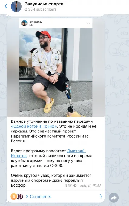 Со стороны нейминг и правда выглядит как минимум необычно. После того, как название стали обсуждать, ведущий RT Антон Красовский пояснил за коллег: никакого глумления над инвалидами не было, автор «Одной ногой в Токио» — сам инвалид.