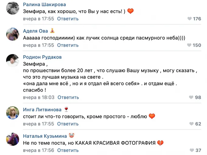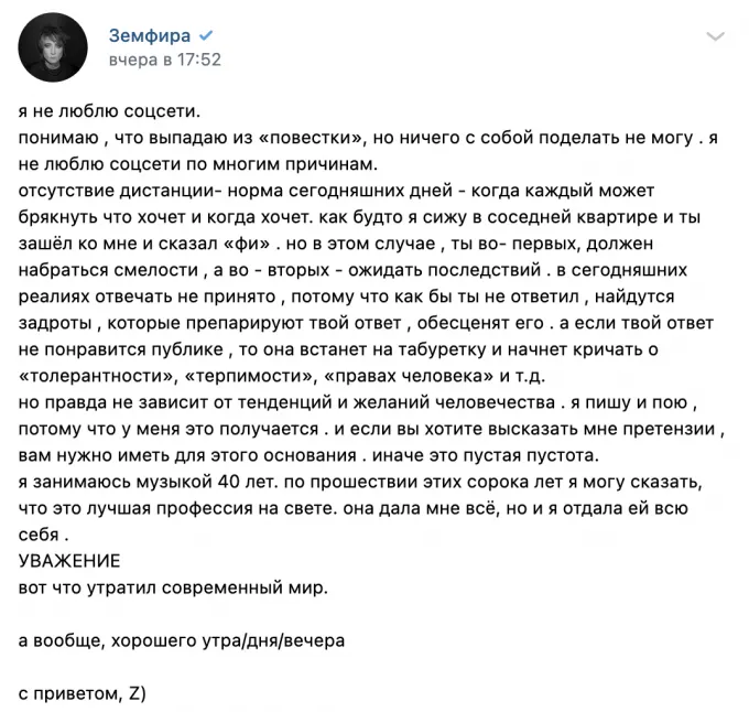 У Земфиры нет аккаунтов в соцсетях, зато есть верифицированная группа в VK, куда выкладываются посты от ее имени. Скорее всего, вчерашняя исповедь была написана лично Земфирой Талгатовной — на это намекают пробелы между знаками препинания.