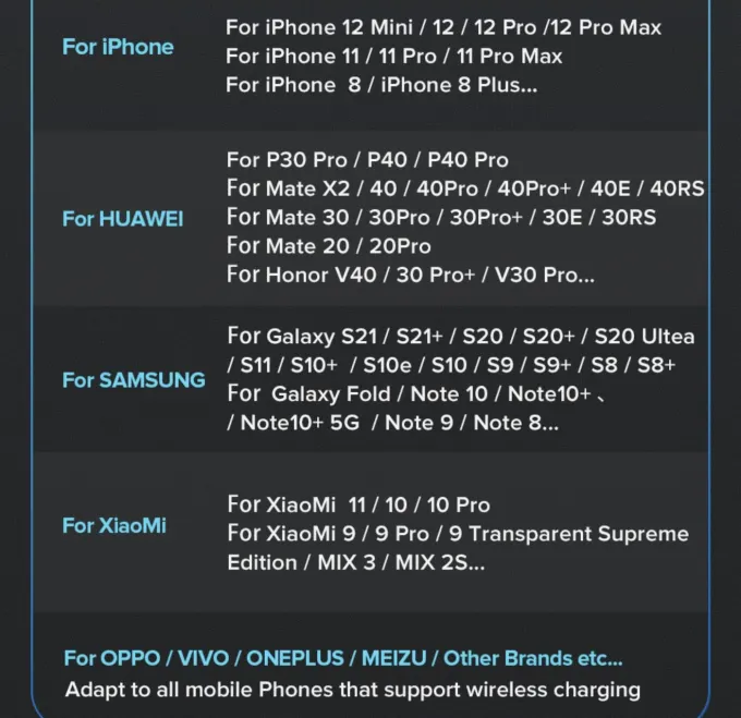 Конечно же, это работает только с девайсами, которые поддерживают зарядку по Qi-адаптерам. Список подходящих устройств вы можете увидеть ниже.