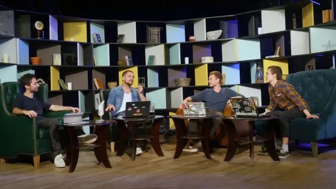 «У студии была другая [отличная от «Порараз Бирацца»] конфигурация: два кресла по бокам и один стол по центру. Туда садился один из ведущих и выдавал набор шуток – грубо говоря, небольшой стендап-монолог, только сидячий. Было пять ведущих и столько же сегментов в программе – каждый вот так садился за стол и обыгрывал свою новость. Например, чувак в центре сдавал три минуты своего материала, а дальше все остальные разгоняли шутки».