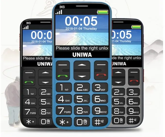 Девайс от компании UNIWA, которая с ходу заявляет, что ориентируется на пожилых людей (даже фото на коробке об этом говорит). Большие кнопки, яркий дисплей, крупные шрифты — все, чтобы вашим родственникам было комфортно и удобно им пользоваться. В некоторых комплектациях в подарок идет MicroSD и док-станция для зарядки — приятно.