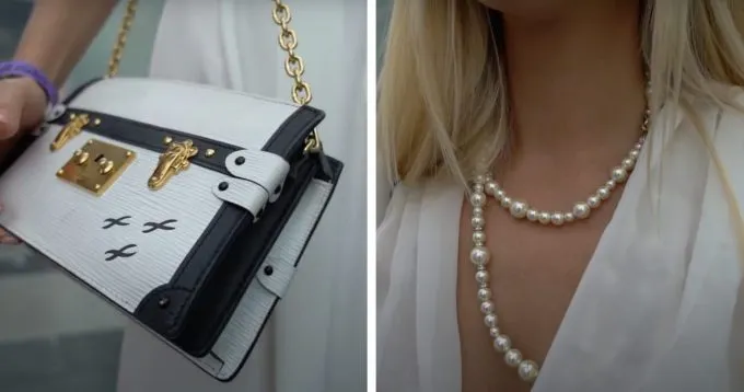 Обзор шмоток миссис Погребняк начался с копеечных цен. Оказалось, что Мария одета в белый костюм из натурального шелка за 35 тысяч рублей, а на ее плече висит сумка от Louis Vuitton. Это примерно 300 косарей. Образ дополняют бусы от Chanel за 180 тысяч рублей.