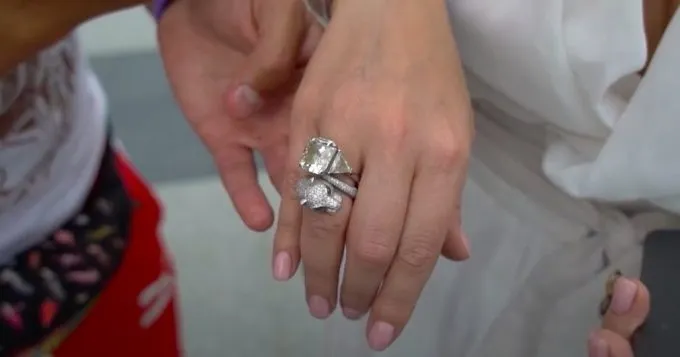 Но настоящая роскошь – чуть выше. С Cartier соседствует кольцо от бренда Graff. Приобрести такой аксессуар можно за 110 миллионов рублей. Но сама Мария не знает точной стоимости украшения. Говорит, это был подарок от звездного мужа. Еще супруга Погребняка призналась, что приехала на съемки на метро. Все это время колечко за полтора миллиона долларов находилось на ее пальце.