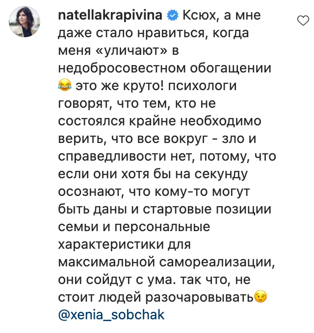 «Я сравниваю себя не с девочками из глубинок, которым, конечно, было тяжелее, это очевидно. Я смотрю на мультимиллионеров, которые тоже чьи-то сыновья и дочери. И по сравнению с ними я боролась за все сама, я всего добилась сама», — подытожила Ксения Анатольевна.