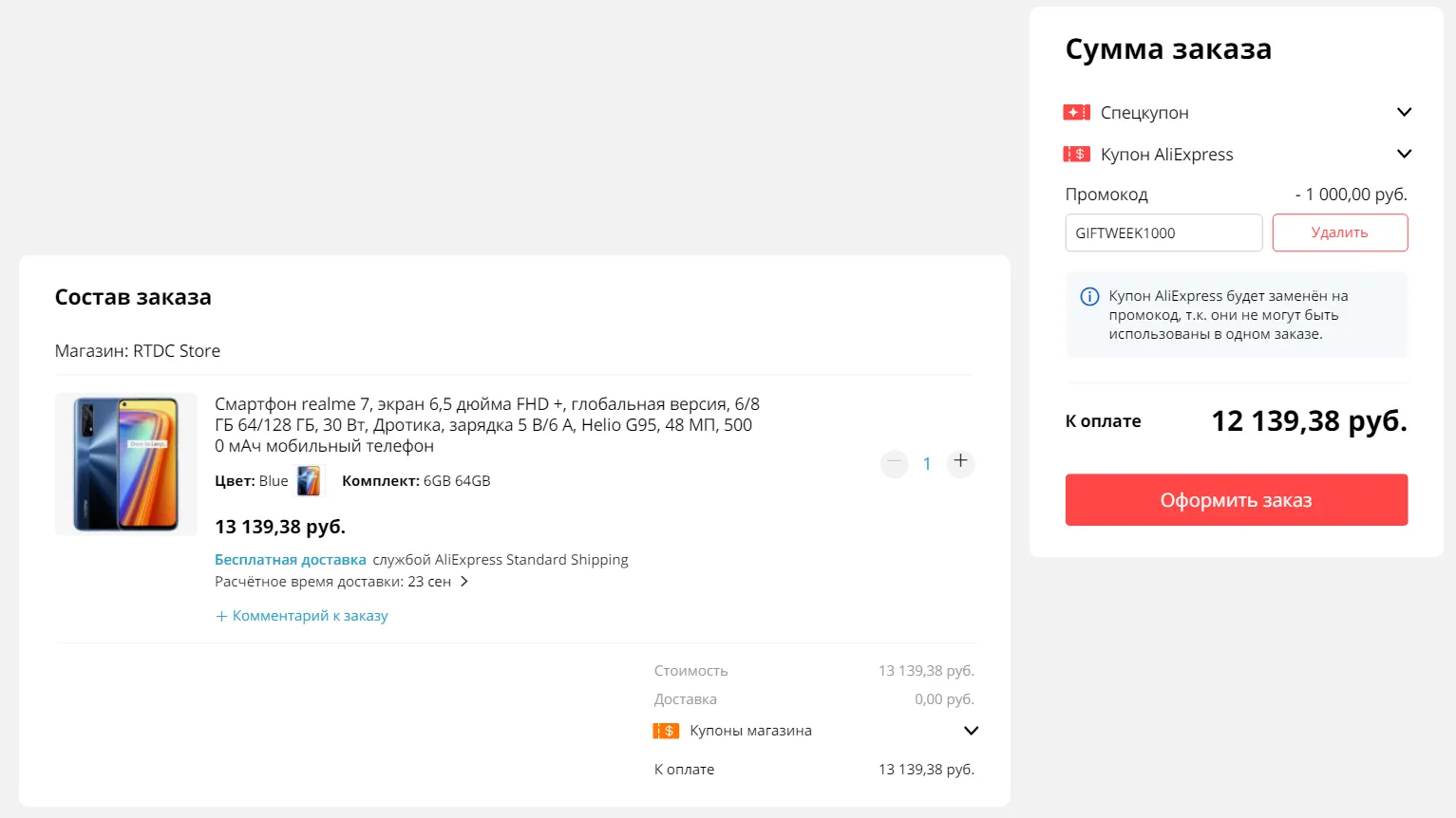 Если решились на покупку Realme 7, запоминайте две вещи: волшебный линк и классный промокод GIFTWEEK1000. Именно этот промик круто скидывает цену младшей версии на 6/64 гига — за нее придется отдать всего 12 140 рублей.
