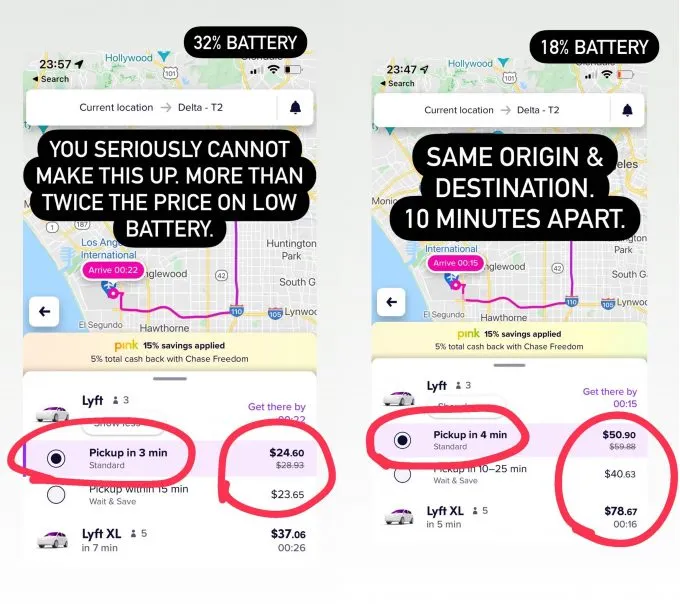 По словам Владимира, если у клиента низкий заряд батареи смартфона, то перевозчики — Uber и Lyft — намеренно завышают цены на поездку. В качестве примера он привел ситуацию: с 32% заряда поездка стоит 25 долларов, с 18% — в два раза дороже. Якобы пользователю некуда деваться и он в любом случае поедет на такси.