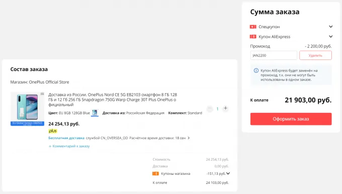 Пришло время рассказать о крутейшем середняке от OnePlus. Nord CE вышел в июне и тут же стал популярен среди гиков и фанов бренда. Решают сбалансированные спеки и невысокий прайс. Обычно за смарт просят 23-24 тысячи (и это с доставкой из Китая — значит, придется оплачивать пошлину), но сейчас есть шанс урвать «норд» меньше чем за 22 кэса. Приятный бонус — отправка со склада в РФ. Значит, можно забыть о долгом ожидании посылки и таможенной пошлине.