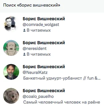 Ситуация максимально смешная — чтобы помешать кандидату, двойники не только отрастили бороду и усы, но и сменили имена. «Мошенничество продолжается. Мои „двойники“, на время выборов ставшие „Борисами Вишневскими“, сменив имя и фамилию, теперь сменили и внешность. Отрастили бороды и усы, и думаю, еще и подретушировались», — заметил настоящий Вишневский в своем твиттере.