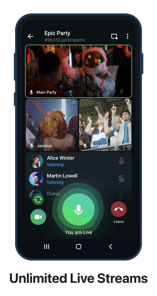 Теперь транслировать видео с камеры устройства (или экран гаджета) может любой пользователь — как в группах, так и в каналах. Ограничений на количество зрителей нет. Во время лайва в трансляции к автору могут присоединиться любые желающие, если блогер даст им слово — как в клабхаусе.