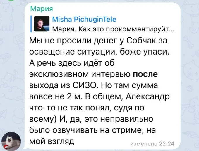 АПД. Мария Нелюбова, девушка Хованского, отрицает, что Юра требовал от Собчак денег за спецвыпуск. Речь шла об эксклюзивном интервью после выхода блогера из СИЗО. Кроме того, сумма, которую озвучил Ресторатор, не соответствует действительности.