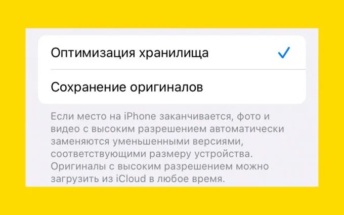 Наконец, заключительный совет. Прыгаем в раздел «Фото» в настройках и выбираем пункт «Оптимизация хранилища». Если вы все сделали правильно, то iPhone начнет выгружать медиафайлы в облако iCloud — на айфоне останутся только лайтовые версии фото и видео.