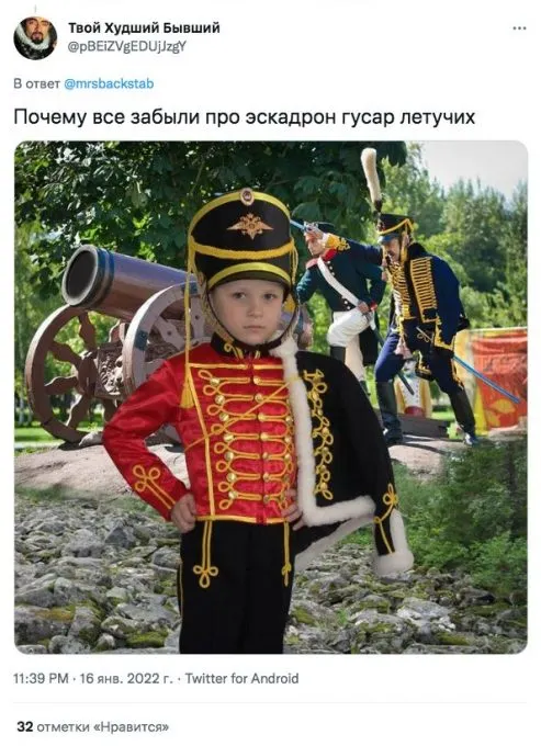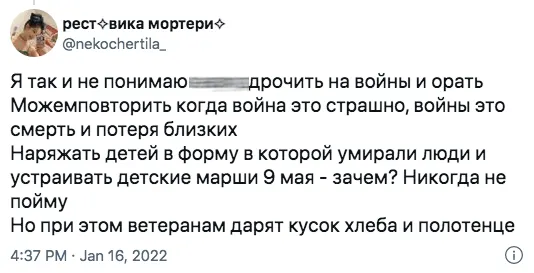 Основная претензия @mrsbackstab и многих других пользователей заключается в том, что родители с помощью своих детей романтизируют войну. Это еще и кринж — разодетые в бушлаты мальчики с автоматами и девочки, примерившие гимнастерки медсестер, не понимают, что происходит.