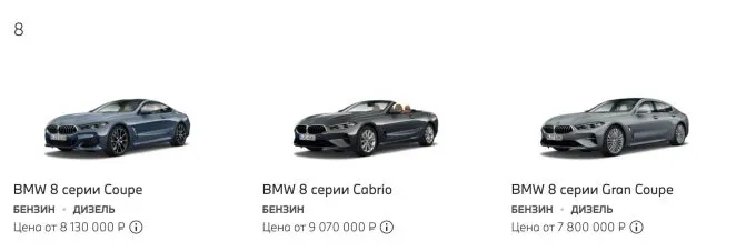 Самый доступный автомобиль BMW 8 серии Coupe обойдется в 8,33 млн рублей: модель имеет 320-сильный двигатель, спортивную автоматическую коробку передач, разгон с 0 до 100 км\час составляет 4,9 сек, расход топлива — 6,5 литров на 100 км. Похожая машина в форм-факторе кабриолета стоит 9,27 млн рублей, а BMW M8 Gran Coupe — 11,73 млн рублей.