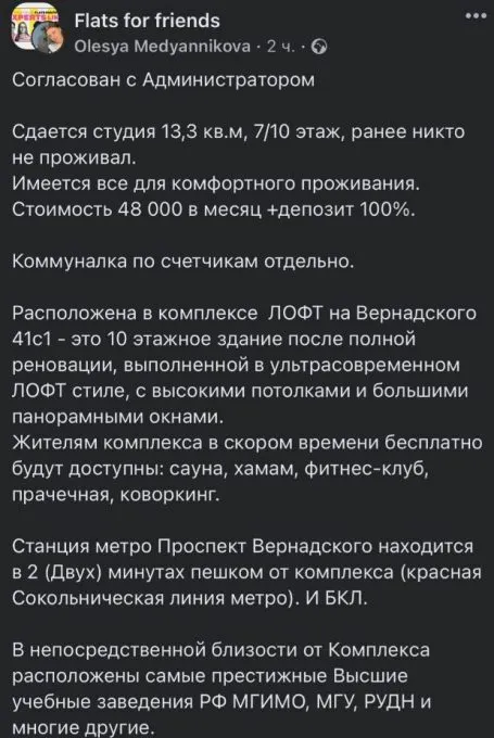 Объявление о сдаче студии появилось в популярном сообществе Flats for friends на фейсбуке (фото квартиры выше). Хозяйка или агент написала, что жилище имеет площадь 13,3 кв. м., находится недалеко от метро «Проспект Вернадского» и стоит 48 тысяч рублей в месяц (коммунальные платежи отдельно). Очень дорого, но зато есть (то есть скоро будут) бесплатные фитнес-центр, сауна, коворкинг, прачечная.