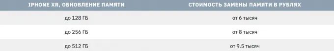 Сколько стоит услуга? Чем новее аппарат, тем дороже. Например, прокачка iPhone 12 до 128 Гбайт в одном из центров обойдется в 13 тысяч рублей, до 256 Гбайт — в 15 тысяч рублей, до 512 Гбайт — в 18 тысяч рублей. На вышедший в 2018 году iPhone XR цены гораздо приятнее — 6, 8 и около 10 тысяч рублей за апгрейд памяти до 128, 256 и 512 Гбайт соответственно.