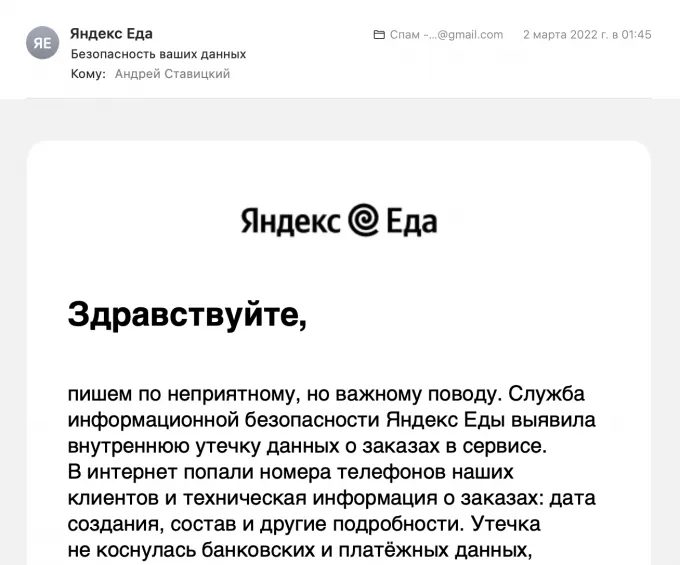 Сама компания еще не выступила с публичными извинениями, но уточняет, что предупредила о сливе своих пользователей. В твиттере авторы аккаунта «Яндекс.Еды» пишут юзерам, что те, кого затронула утечка, получили письма с предупреждением в начале марта. Так и было, только у многих письма (например, у авторов «Палача») улетели в папку «Спам».