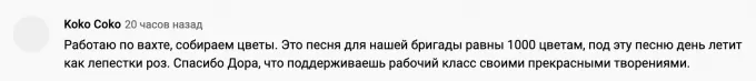Люди пишут однотипные комменты о том, как новый трек и клип артистки сделал их тяжелую жизнь чуточку лучше. Доре (настоящее имя — Дарья Шиханова) шлют респекты представителей мужских профессий, вроде сталеваров, слесарей, механиков, шахтеров.