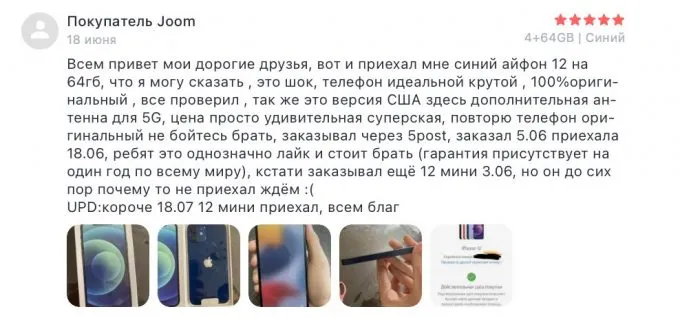 Что ещё настораживало людей? Как правило, больше всего покупатели опасались, что товар окажется в лучшем случае восстановленным, а в худшем — неоригинальным. Ещё изначально не всем было ясно, аппараты предназначенные для какого рынка будет рассылать продавец — айфоны с приставкой CN не поддерживают FaceTime и e-SIM, а американские якобы могут быть заблокированы для пользователей сторонних операторов связи. К тому же могли напрягать сроки доставки. Так как появились небольшие проблемы с логистикой, при худшем сценарии максимальный срок может составлять 105 дней — разумеется, не все готовы столько ждать. Сначала сомнения были и у нас, но в Joom заверили, что все продающиеся гаджеты точно подходят для использования на территории России, а посылки постараются привезти вовремя.