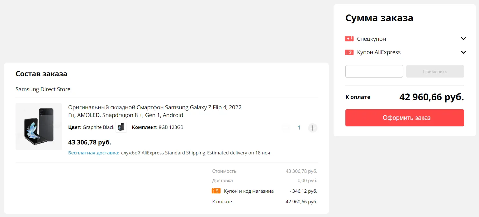 Что по цене? Прямо сейчас смарт сливают от 42 960 рублей с учетом купона продавца на 350 рублей — вот линк. 1 ноября прайс еще немного упадет — до 42 770 рублей. Возможно, добавят какие-нибудь выгодные купоны, но мы не советуем ждать — девайс можно спокойно брать и сейчас. Для сравнения, в России за «флип» просят минимум 54 тысячи.