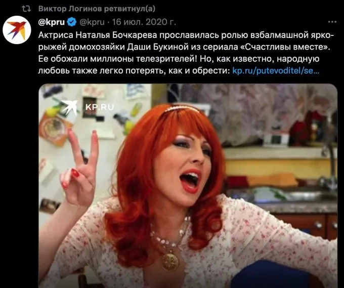 Репостит новости о бывшей коллеге по съемочной площадке Наталье Бочкаревой: