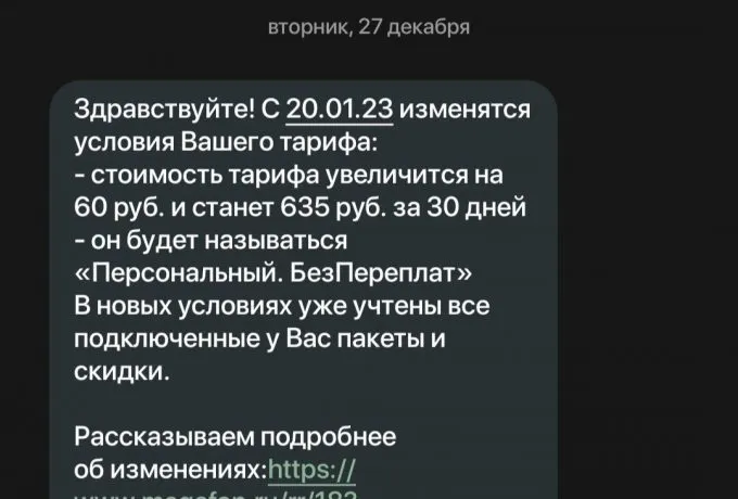 Так, одному из абонентов «Мегафона» рассказали, что связь подорожает на 32,5 рубля в месяц — до 257,5 рублей. Другому клиенту сказали, что теперь он будет платить на 55 рублей больше — до 595 рублей ежемесячно. Такие же месседжи получили абоненты Tele2.