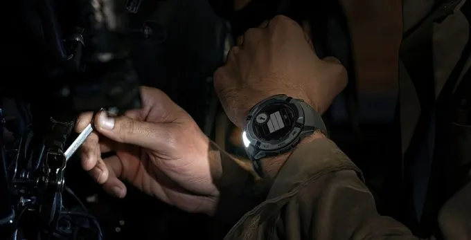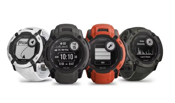 У Instinct 2X Solar дизайн туристических часов, 1,1-дюймовый монохромный MIP-дисплей с разрешением 176 x 176 пикселей, мягкий резиновый ремешок, физические кнопки для управления. Девайс может чекать пульс, насыщенность крови кислородом, сон. Также присутствует опция контроля активности.