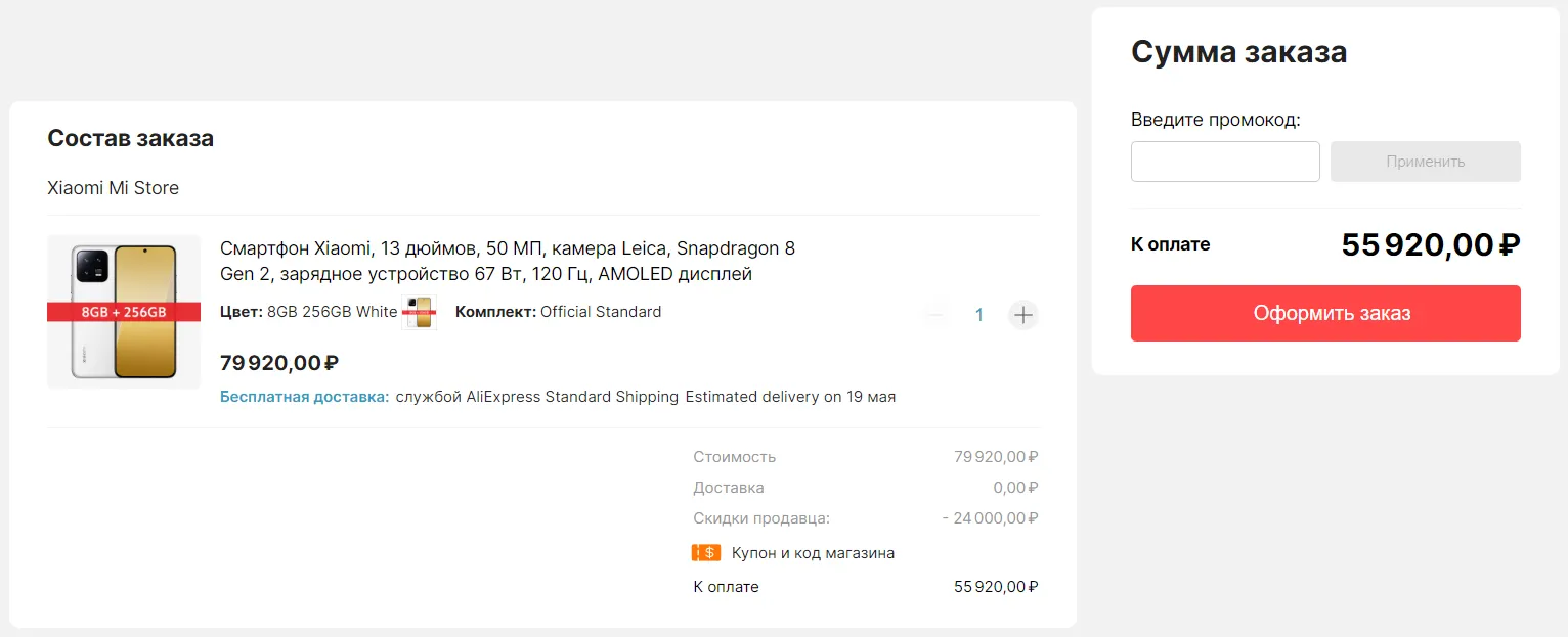 На старте продаж гаджет отдавали на Али почти за 57 кэсов, а потом цена поднялась аж до 85 штук. К счастью, прайс снова просел, и сейчас Xiaomi 13 можно забрать всего за 55 920 рублей с учетом купона продавца на 24 косаря. Для сравнения, в России смарт отдают от 59,2К, но такая цена актуальна лишь для Москвы — в регионах стоимость выше. В любом случае, оставляем как ссылку на Али, так и линк на Маркет — хватайте «тринашку» там, где вам удобно.