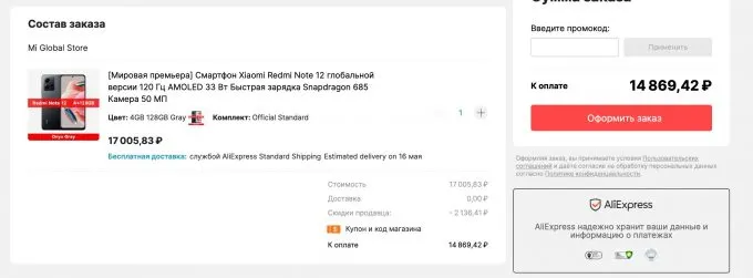 Как получить скидку? По умолчанию за Redmi Note 12 просят 17 005 рублей на Али, однако можно взять купон продавца прямо на странице товара и хапнуть смартфон всего за 14 869 рублей при условии, что вы закажете самую младшую конфигурацию. Но медлить нельзя, ведь купон может сгореть в любой момент. Вот нужная ссылка.