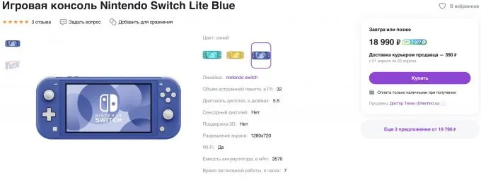Прямо сейчас на СберМегаМаркете консоль Nintendo Switch Lite можно купить за 18 990 рублей, при этом 7977 рублей вернуться в качестве бонусов, которыми можно оплатить другие покупки на платформе. Если учитывать этот фактор, то приставка обойдётся всего то в 11 013 рублей. Для ленивых есть этот же лот на AliExpress, но за 14 640 рублей.