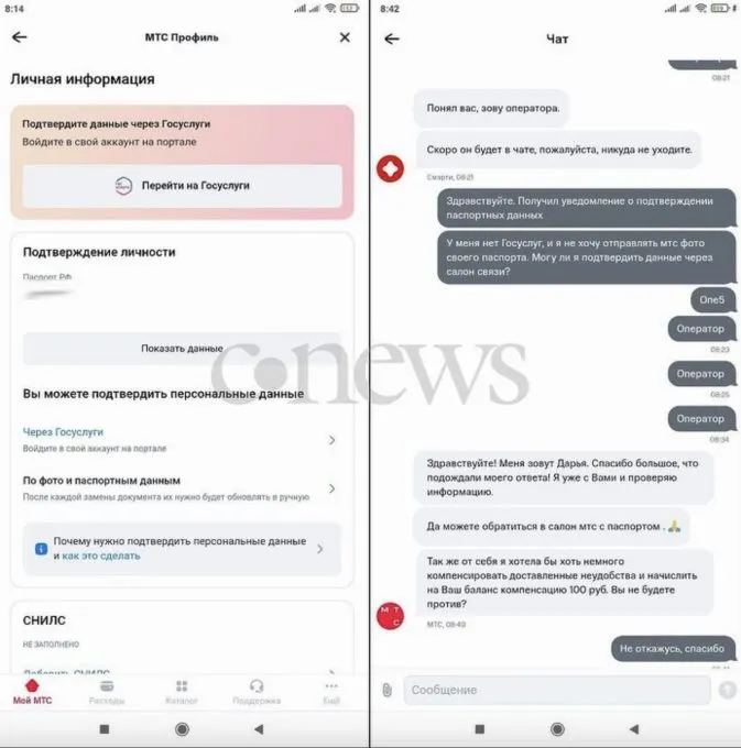 Как подтвердить личные данные, чтобы не остаться без сим-карты? Во-первых, можно отправить фотографию с паспортом и со своим лицом в чат с техподдержкой, во-вторых, дойти до салона сотовой связи. В-третьих, подтвердить инфу через Госуслуги. Авторы Cnews заметили, что операторы настойчиво предлагают абонентам пройти проверку через ГУ, хотя в России пока нет закона, который обязывал бы иметь учетную запись на этом сервисе.