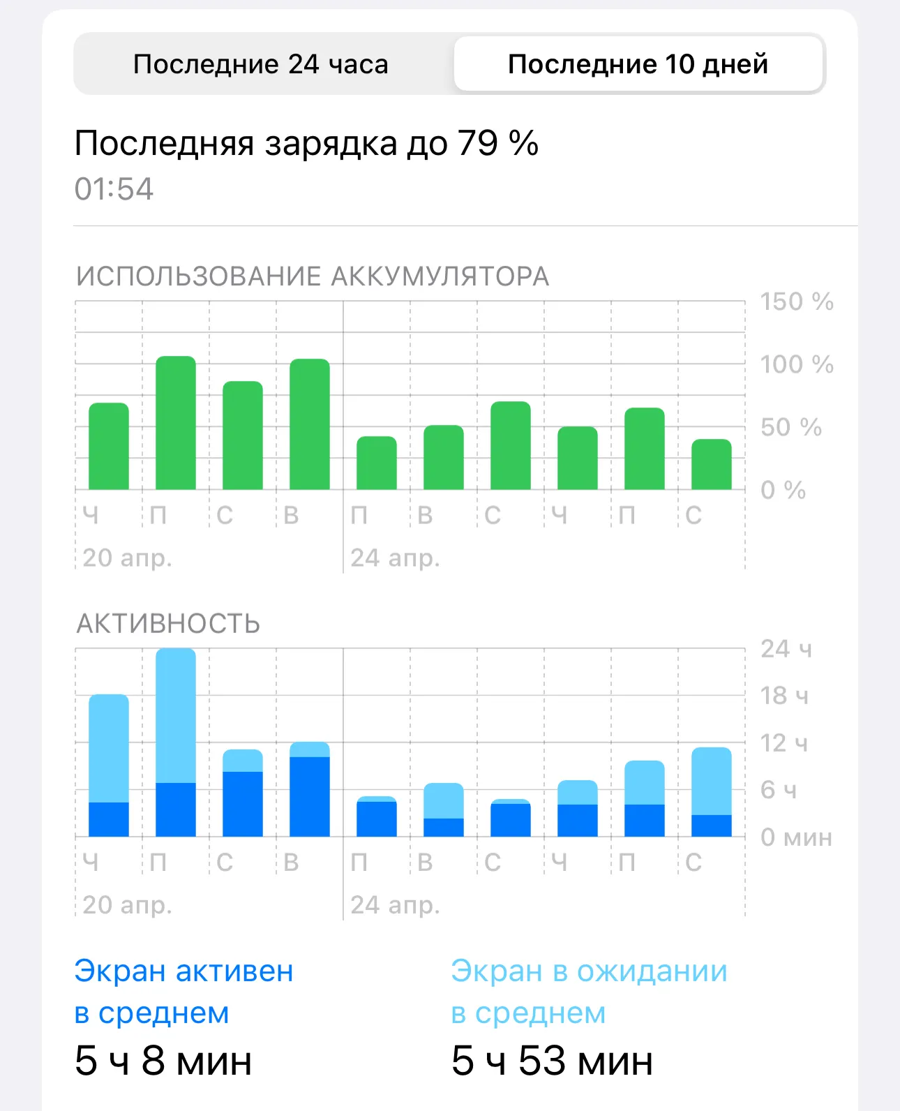 Чудеса начинаются, когда либо пользуешься девайсом редко, либо когда используешь классические сценарии — звонки, Safari, другие встроенные приложения. Вот тогда 14 Pro Max может спокойно протянуть пару суток на одном заряде. Я часто раздаю интернет с телефона и пользуюсь навигатором в машине — тут проценты заряда тают довольно быстро.