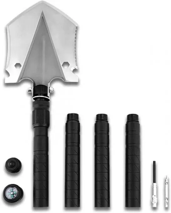 Инструмент поставляется в небольшой сумке. Полотно лопаты сделано из нержавеющей стали, а черенок — из качественного анодированного алюминия, который выдерживает нагрузку до 1800 кг. Производитель предусмотрел специальные ребристые вставки для обеспечения надёжной и комфортной фиксации в руках во время работы. В рукоятку также встроен компас, устройство для розжига, шестигранный ключ, гильза для отвёртки и даже свисток. Простыми словами — тут собран максимально полезный набор выживальщика в лесу.