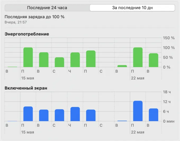 - Отличная автономность. За полгода ежедневного использования — в комнате далеко от розетки, в машине, на природе — батарея насчитала всего 80 циклов. В Apple установили максимальное количество циклов в 1000 штук, то есть аккумулятор должен прожить еще лет 5-6 точно. Сразу после покупки хотелось устраивать гонки на выносливость с секундомером, но сейчас я каждое утро просто хватаю стоящий на зарядке ноут и начинаю работать. Как видно из скриншота ниже, компьютер работает по 8-10 часов ежедневно и выжирает не больше 70-80% — превосходный показатель