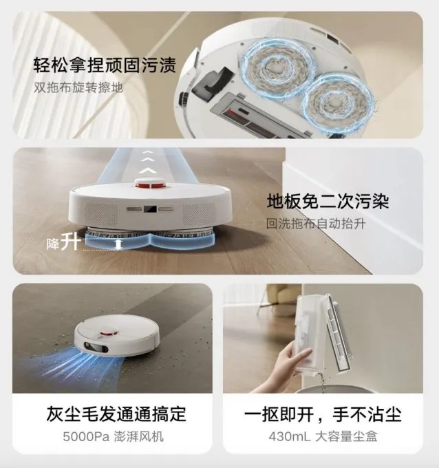 Пылесос получил лидар для построения карты и камеру для улучшенной навигации и объезда препятствий. Мощность всасывания составляет 5000 Па, встроенный контейнер имеет емкость 430 мл. В нижней части устройства расположены две круглые тряпки, которые намачиваются и вращаются со скоростью 180 оборотов в минуту.