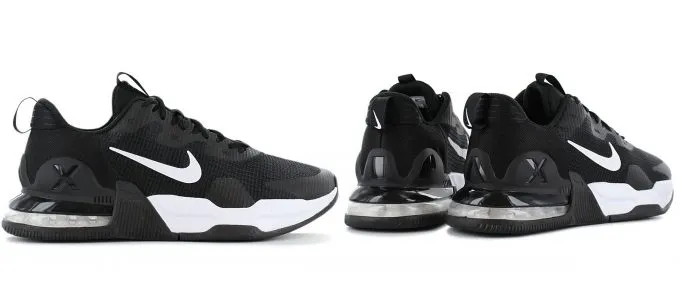 Теперь к айтемам. Первая модель – черно-белые Nike Air Max Alpha Trainer 5. Это технологичные кроссовки с воздушным баллоном Air Max, обеспечивающим амортизацию при ходьбе. Воротник из пеноматериала защищает лодыжку, а сетчатый верх делает занятия спортом комфортными.