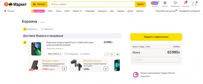 Хотите забрать «тринашку» с максимальной выгодой? Переходите по ссылке на Яндекс.Маркет — там iPhone 13 128 Гбайт обойдется вам всего от 63 990 рублей. Кстати, в подарок к айфону покупатели получат зарядное устройство Hoco C94A мощностью 20 Вт — небольшой, но приятный плюс. Напоминаем, что прайс указан для Москвы — жителям других городов нужно переключиться на столицу и проверить можно ли оформить доставку.