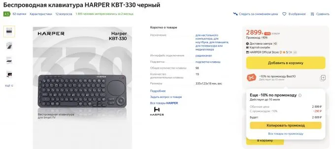 Обычно за Harper KBT-330 просят около 4 косарей, но сейчас её можно купить на Яндекс.Маркете всего за 2609 рублей по промокоду Best10 (ищите продавца HARPER Official Store). Также вы можете получить щедрый кэшбек в 10% с этой покупки при оплате картами некоторых банков.