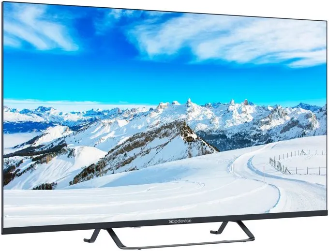 Topdevice Frameless 40’’ — яркий представитель среднеценового сегмента умных телевизоров с 40-дюймовым LCD-дисплеем с LED-подсветкой, разрешением Full HD (1920×1080 пикселей) и типичной частотой обновления 60 Гц. Уникальная особенность этой модели — ультратонкие рамки, которых нет даже в некоторых более дорогих девайсах. Отдельного внимания заслуживает ножка необычной формы, что придаёт устройству более солидный и премиальный вид. При желании его можно повесить на стену с помощью VESA-крепления. Так он будет выглядеть ещё круче.