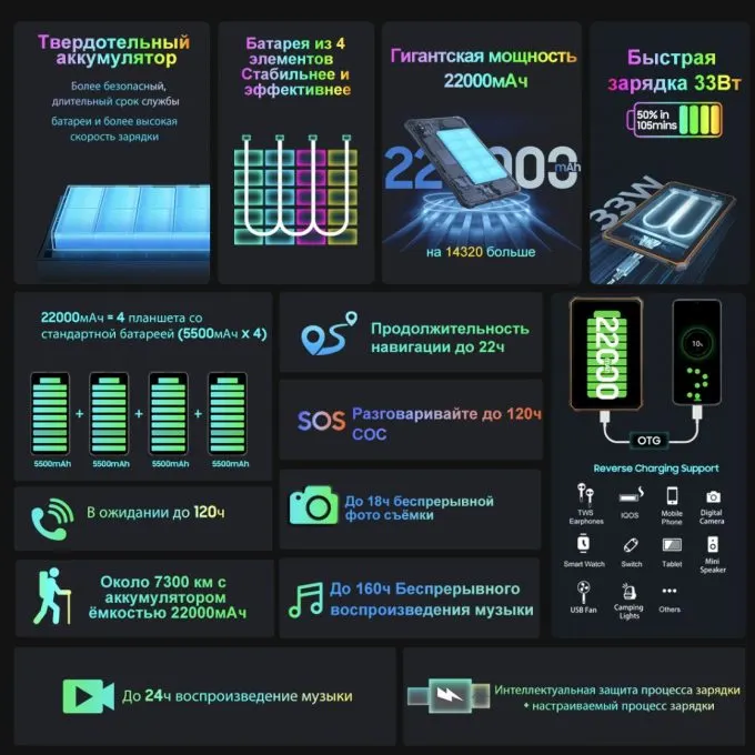 Аккумулятор — отдельная тема. Батарея Blackview Active 8 Pro имеет емкость 22000 мАч с автономностью 24 часа. Девайс поддерживает быструю зарядку 33 Вт и даже может работать в качестве пауэрбанка. Время работы в режиме ожидания — рекордные 1440 часов.