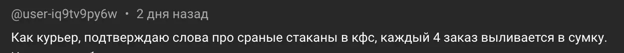 Ответ натурально шокировал. Оказывается, так складывают напитки в самих ресторанах. Еще раз: там специально берут стакан, поворачивают его на бок и кидают в сумку несчастному курьеру. Узнав это, я просто принял для себя, что в KFC теперь нет напитков – только еда. Более того, рассказал о проблеме на ютубе (смотреть с 17:19):