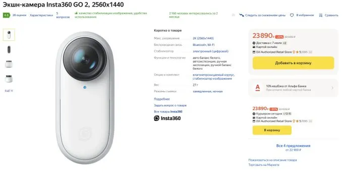 Сейчас на Яндекс.Маркете крутейшую камеру для влогов Insta360 GO 2 можно урвать за 23 890 рублей. Также не стоит забывать, что некоторые банки готовы отсыпать щедрый кэшбек до 10% за покупку на этой платформе.