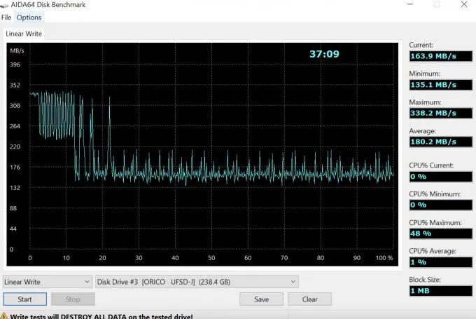 Самое главное — скорость. Заявлено, что при записи флешка дает 350 Мбайт/сек, чтении — 411 Мбайт/сек. По словам автора, реальная средняя скорость колеблется в диапазоне около 180 Мбайт/сек. Скорость копирования — 250 Мбайт/сек. «Это очень быстрая флешка. На самом деле очень быстрая. Понятное дело, что максимальная скорость через какое-то время падает, но за это время флешка успевает „сожрать“ далеко не один гигабайт», — заметил обзорщик.