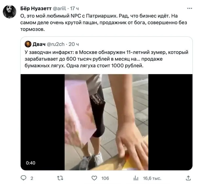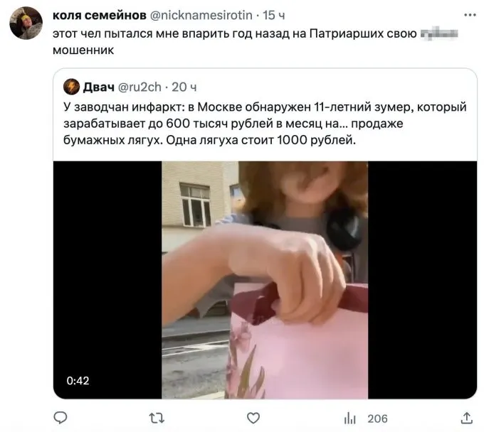 «У заводчан инфаркт», — отреагировали на ролик авторы твиттер-аккаунта «Двач». В комментариях пользователи посмеялись на бизнесом малолетнего коммерсанта и предположили, что даже богатым москвичам не впарить бумажную поделку за косарь. Многие заявили, что ребенок лжет.
