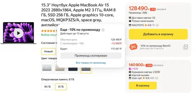 Одно из таких устройств — свежий MacBook Air 15″, который можно приобрести на Маркете минимум за 115 641 рубль с учётом промокода Best10 на момент написания заметки. Фаворит «Палача» появился на рынке ещё в начале лета и на удивление не только не дорожал, а наоборот дешевел. Если первые партии устройств продавали за 150-160 тысяч рублей, то со временем прайс стал максимально оптимальным. Есть вероятность, что в ближайшее время продавцы превентивно повысят цены на 10-15 тысяч рублей, так что смысл задуматься о покупке действительно есть.