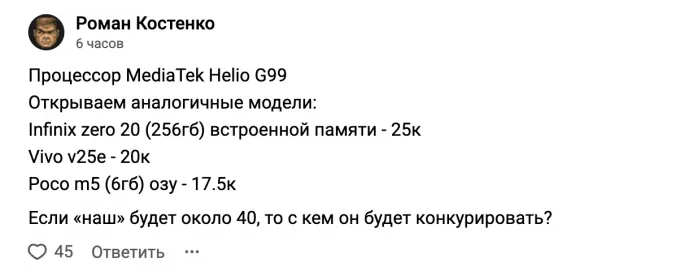 Информацию о «Р-ФОН» раскрыл глава Ассоциации профессиональных пользователей соцсетей и мессенджеров (прикиньте, есть такая организация) Владимир Зыков в своем телеграме. По его словам, устройство будет иметь 6,7-дюймовый дисплей, процессор MediaTek Helio G99, 8/128 Гбайт памяти, основную камеру разрешением 50 мегапикселей, батарею емкостью 5000 мАч.