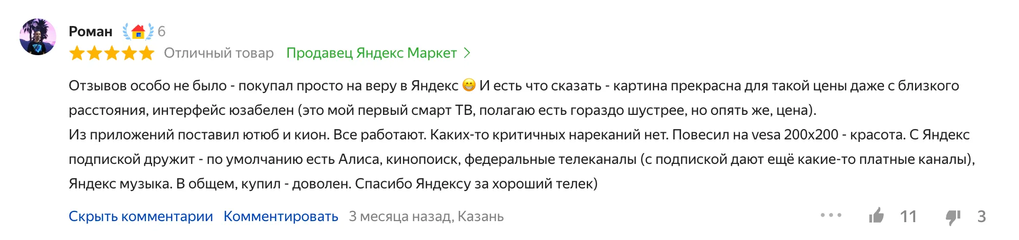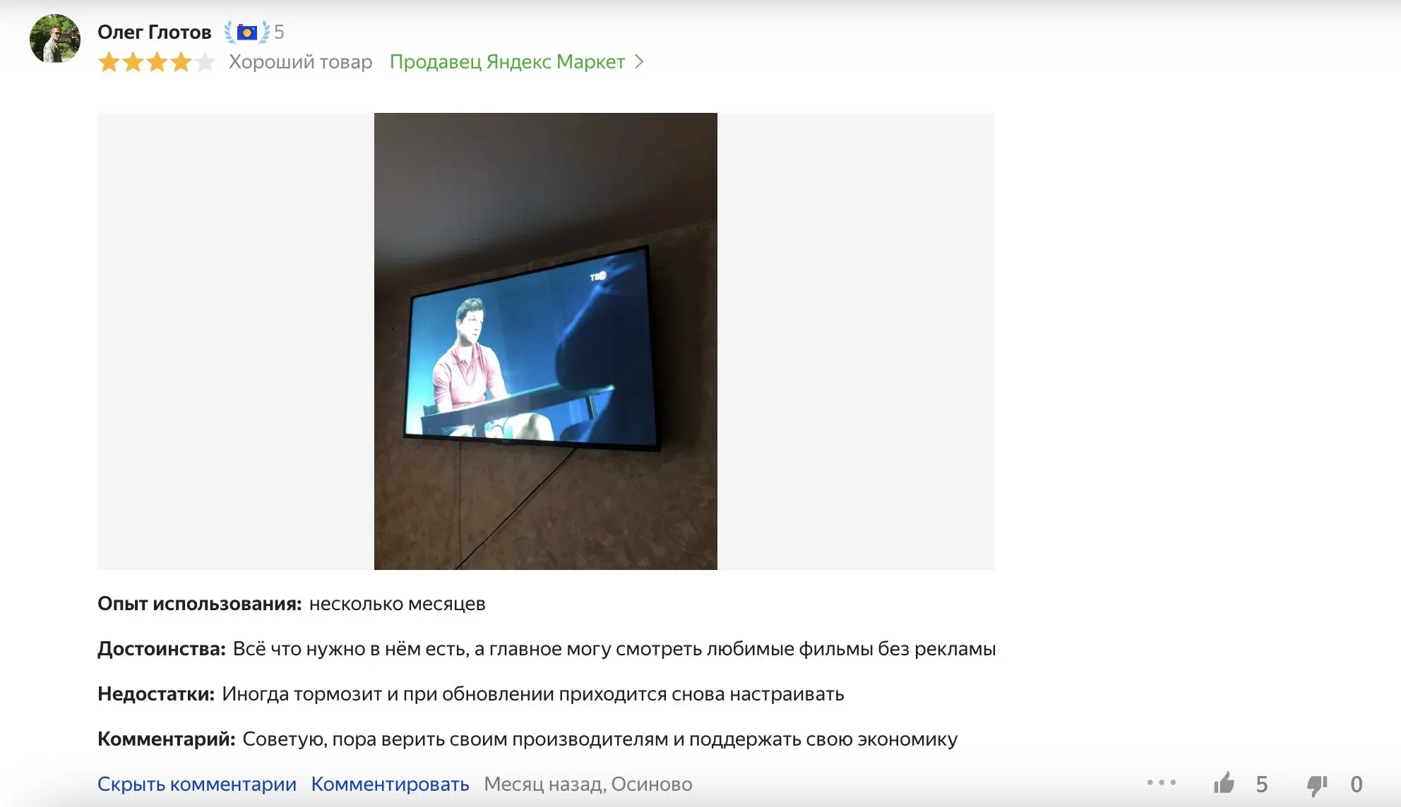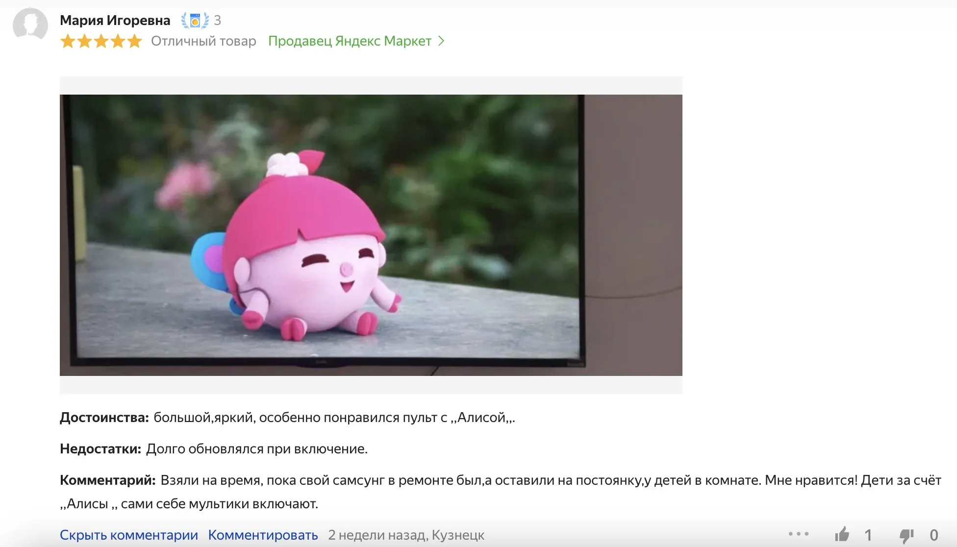 У девайса хорошие отзывы — 4,7 балла на основе почти 500 оценок. Телевизор ругают только за то, что иногда модель тупит при включении — у аппарата не очень много оперативной памяти.