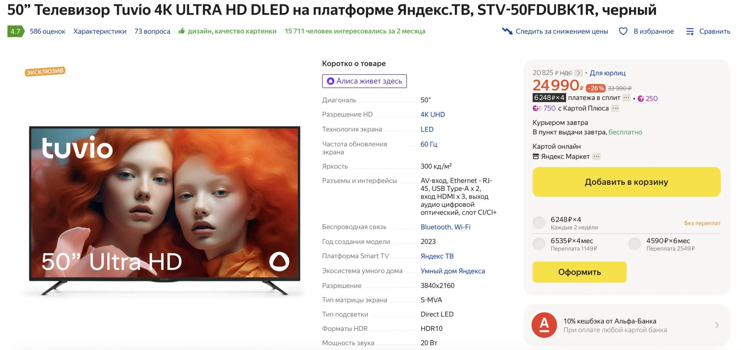 Купить Tuvio Frameless 4K Ultra HD можно только на Маркете — за 24 990 рублей (1000 баллов вернется кешбеком на «Плюс»).