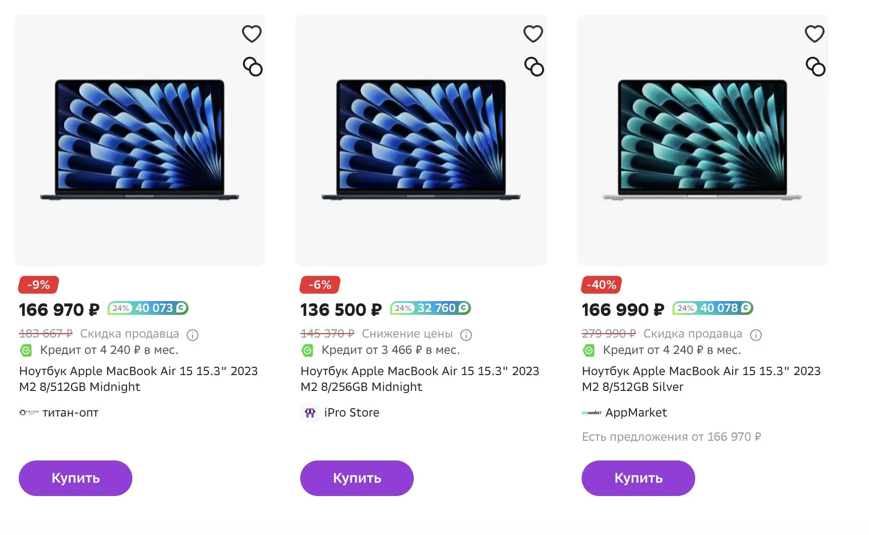 Еще маки появились на «МегаМаркете». Тут девайс предлагают за 136 500 рублей — дороже, чем на Маркете, но все решают бонусы «Спасибо»: платим 136К и получаем кэшбек 32 760 баллов «Спасибо». Если вы знаете, куда потратить баллы от Сбера (например, доставка из магазинов или другие покупки на площадке), то лучше покупать здесь.